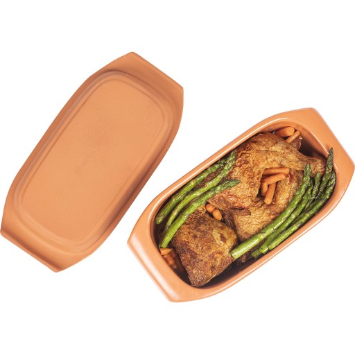 Podłużny garnek rzymski 2,5 L pozwala na łatwe utrzymanie kształtu i odpowiedniej wilgotności potrawy.