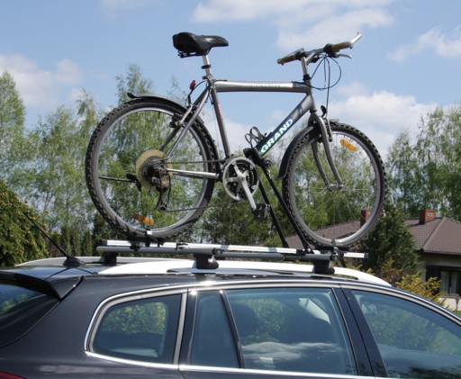 Praktyczny i lekki aluminiowy uchwyt do przewożenia rowerów przeznaczony jest do montażu na bagażniku dachowym auta (belkach).