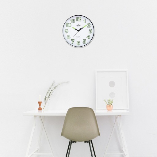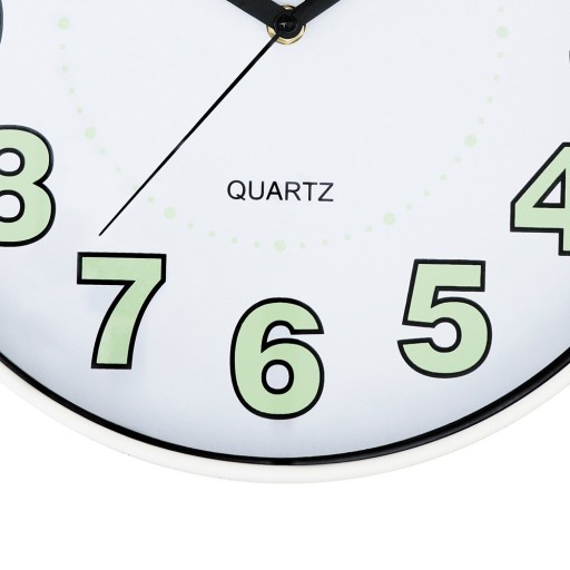 Biała obudowa oraz tarcza, wykonane z plastiku oraz wyraziste cyfry sprawiają, że zegar jest doskonale czytelny. Dodatkowo zarówno cyfry jak i wskazówki pokryte są powłoką luminescencyjną, co daje ładny efekt w ciemności.