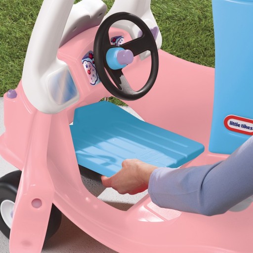Różowo niebieska wersja klasycznego Cozy Coupe idealna dla małej księżniczki. Samochód może być wprawiany w ruch za pomocą nóg dziecka, bądź popychany jak wózek przez osobę dorosłą. Dzięki takiemu rozwiązaniu z auta mogą korzystać także mniejsze dzieci.