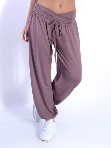 Spodnie typu alladynki. Odcięte szerokim pasem, wiązane z przodu, krok lekko obniżony.