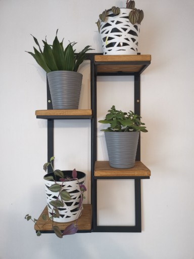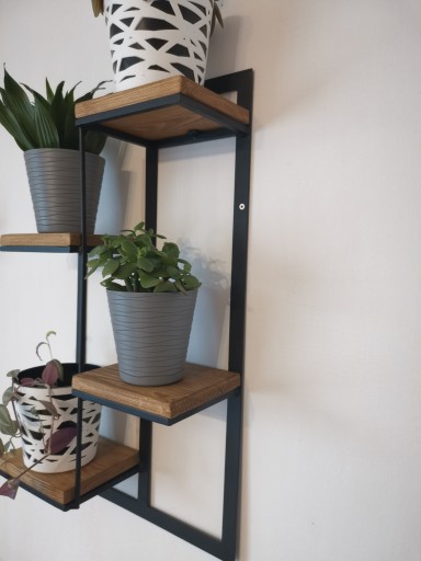 Półka regał na kwiaty wisząca w stylu loftowym , podstawa tylnia z płaskownika 25x4 mm gruba i stabilna , podstawy półek z pręta kwadratowego 1 cm . deska sosnowa w odcieniu dąb ciemny o grubości 2 cm i wymiarach 16x16 cm .