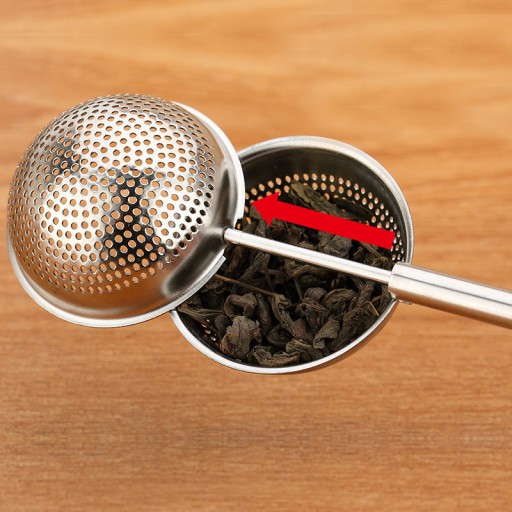 Wykonany ze stali nierdzewnej filtr do zaparzania ziół, kawy i herbaty, w formie kuli z uchwytem.
