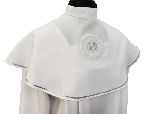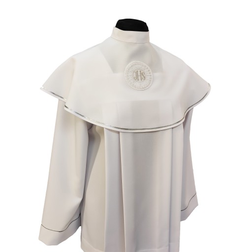 Dwu elementowa Komża Komunijna z kołnierzem. Kołnierz zapinany z tyłu, z przodu naszyta srebrna HOSTIA. Minimalna liczba zdobień, kołnierz i rękawy obszyte srebrną tasiemką. Komża została uszyta z tkaniny syntetycznej typu "strecz". Komża bardzo praktyczna w użytkowaniu, łatwo się pierze, prasuje. Komża dostępna jest w rozmiarach 152-158-164.