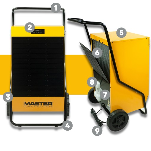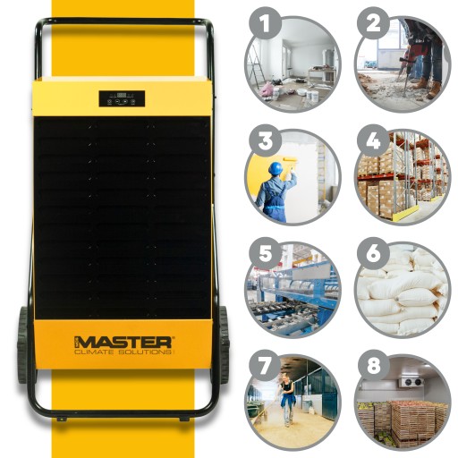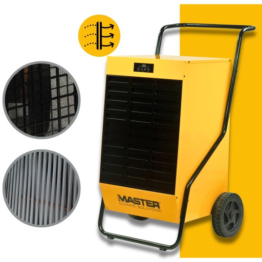 Seria osuszaczy przemysłowych Master (modele: DH 26, DH 44, DH 62, DH 92) charakteryzuje się wyjątkową odpornością na kurz, pył oraz inne zanieczyszczenia, ponieważ posiadają wbudowany filtr powietrza, który pozwala na pracę nawet w najbardziej zakurzonych miejscach.