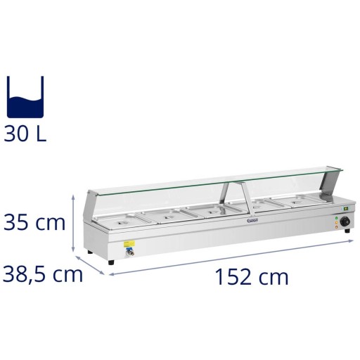 Niezawodny bemar z pięcioma pojemnikami GN 1/2 i przykrywkami marki Royal Catering jest sprzętem, który sprawdzi się w barach, restauracjach, bufetach, stołówkach, firmach cateringowych itp. Urządzenie działając na zasadzie kąpieli wodnej, skutecznie podgrzewa i utrzymuje ciepło dań oraz przekąsek serwowanych gościom np. podczas imprez z bufetem lub szwedzkim stołem. Produkt pozwala też korzystać z innych konfiguracji pojemników GN np. 2 x 1/1 GN + 1/2 GN, 6 x 1/3 GN + 1/2 GN, itd.