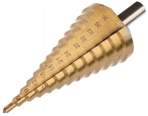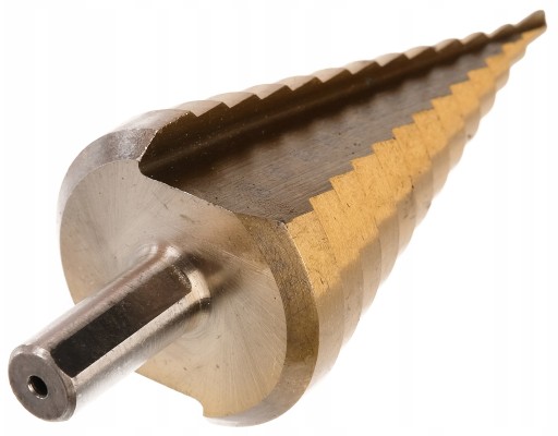 Bardzo wysokiej jakości wiertło stopniowe stożkowe, wykonane z wysokogatunkowej stali szybkotnącej HSS + TYTAN. Przeznaczone do metali, blach stalowych cienkościennych, tworzyw sztucznych.