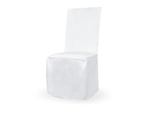 Pokrowiec komunijny na krzesło z satyny w kolorze białym, bez zakładek, z nadrukowanym emblematem IHS w kolorze złotym.