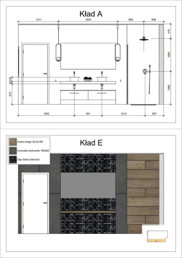 W projekcie otrzymasz wszystkie niezbędne rysunki do wykonania całego projektu. Precyzyjne kłady z opisem użytych materiałów wraz z ich formatami rozwieją wszystkie wątpliwości co do rozmieszczenia płytek na ścianach.