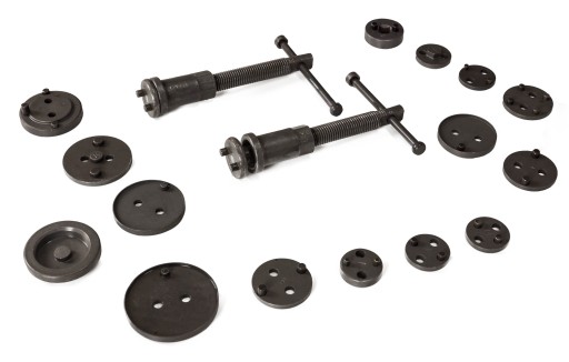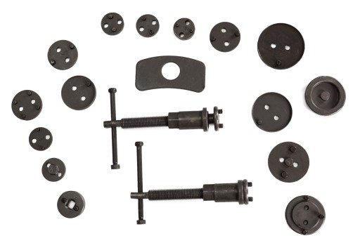 Profesjonalny 18 - elementowy zestaw do cofania/wyciskania tłoczków w cylinderkach układów hamulcowych. Niezbędny przy naprawach pojazdów wyposażonych w hamulce tarczowe. Zestaw przeznaczony jest dla każdego warsztatu samochodowego jak również przydomowego garażu , gdzie pomaga przyspieszyć serwisowanie układów hamulcowych.
