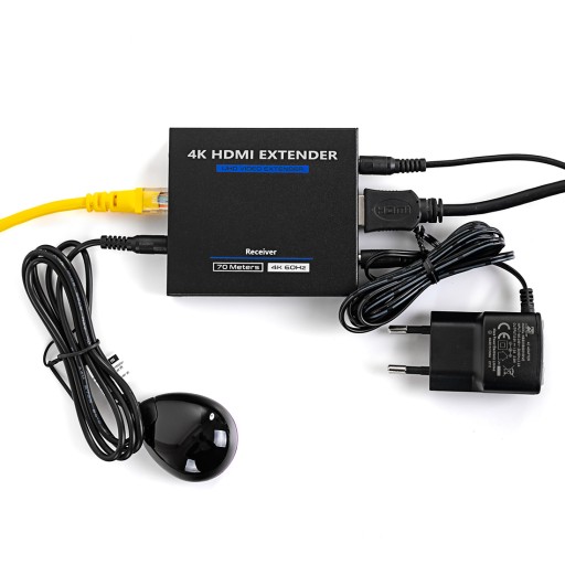 Przedłużacz HDMI umożliwia transmisję i rozszerzenie nieskompresowanego sygnału HDMI UHD 4K @ 60Hz za pomocą kabla sieciowego CAT6 / 6A / 7, odległość transmisji wynosi do 70 metrów w rozdzielczości 4K przy zerowym opóźnieniu. Zestaw zawiera jednostkę nadajnika (TX) i jednostkę odbiornika (RX), pracujące jako para. Urządzenie posiada funkcje obsługi dwukierunkowej IR.