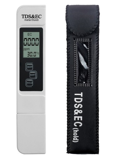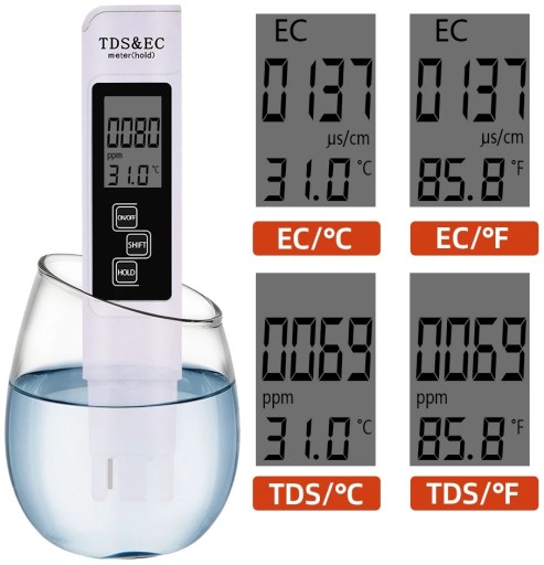 - Funkcje: TDS (Total Dissolved Solids - ilość rozpuszczonych w wodzie zanieczyszczeń), EC (Przewodność wody)