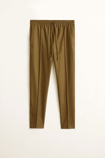 Elastyczna talia, zwężane nogawki.