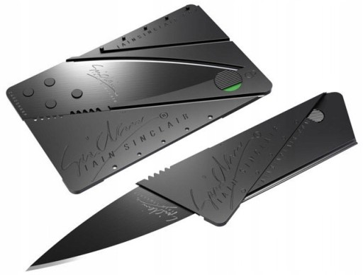 - Karta kredytowa, którą kilkoma prostymi ruchami zamienisz w ostry nóż z 65 mm ostrzem. W pozycji złożonej ostrze zabezpieczone jest blokadą, która nie pozwala na przypadkowe otwarcie się noża w kieszeni czy w portfelu.