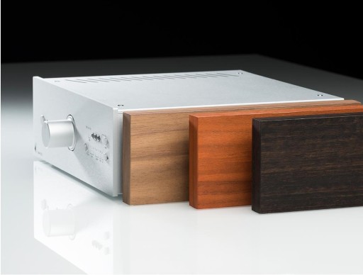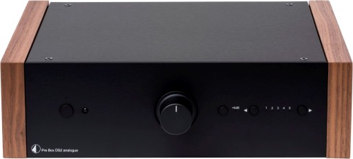 Pro-Ject Pre Box DS2 Analogue w kolorze czarnym z panelami bocznymi z prawdziwego drewna orzecha to audiofilski przedwzmacniacz stereo z wejściami analogowymi, nowy komplet wyprodukowany w Europie.