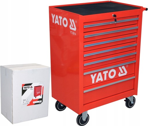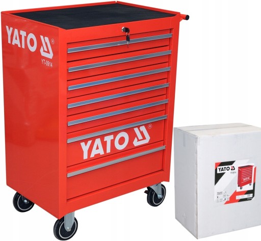Szafka serwisowa marki YATO. Posiada 7 szuflad na prowadnicach kulkowych, wyłożonych pianką. Profile wykonane z wytrzymałej blachy stalowej. Blat wyłożony olejoodporną gumą. Szafka posiada duże gumowe koła, w tym dwa obrotowe z zabezpieczeniem. Odporna na duże obciążenia do 300 kg. Niezbędna w warsztatach samochodowych i stacjach obsługi pojazdów.