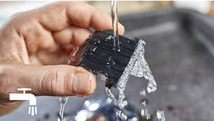 Wystarczy kliknąć, aby zwolnić zdejmowaną głowicę i ostrza, a następnie je wyczyścić.