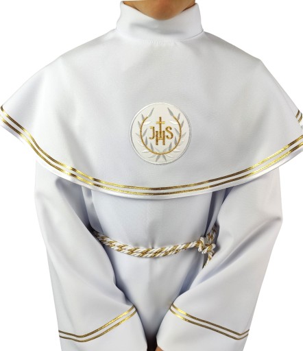 Rękawy i pelerynka obszyte są złotą pasmanterią. Do alby dołączamy dopasowany do obszyć sznur, który podkreśla liturgiczny charakter szaty.