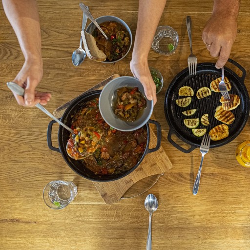 Dodatkowym atutem wykorzystania żeliwa jest również bardzo szybkie i równomierne nagrzewanie się naczyń oraz oddawanie przez nie ciepła. Estetyka garnka oraz patelni sprawia, że oba naczynia nadają się również do serwowania potraw bezpośrednio na stół. Żywność przy takiej formie podania nie tylko prezentuje się elegancko, ale także dłużej utrzymuje ciepło i cieszy pełnym smakiem!