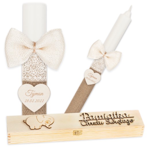 - grawer techniką laserową - do świecy przytwierdzona jest zawieszka (gratis), na której grawerujemy imię dziecka oraz datę uroczystości. Laser wykorzystujemy również do precyzyjnego wykończenia obrzeży szatki. Do grawerowania stosujemy najnowsze urządzenia światowego lidera.