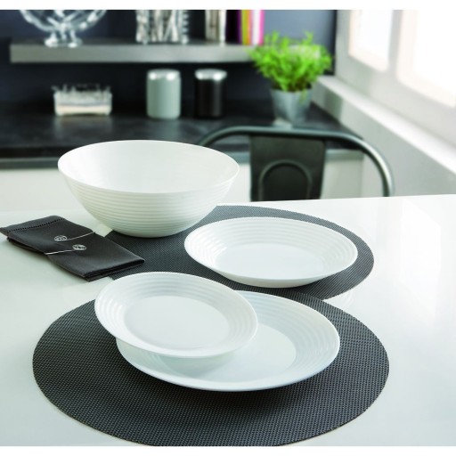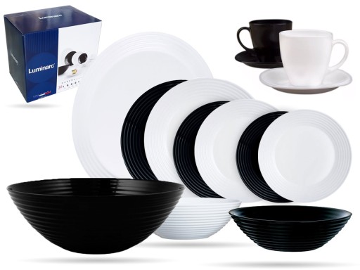 Harena Luminarc to czarnobiały serwis obiadowo-kawowy na 6 osób - składa się z 38 elementów i wykonany z hartowanego szkła z delikatnymi prążkami.
