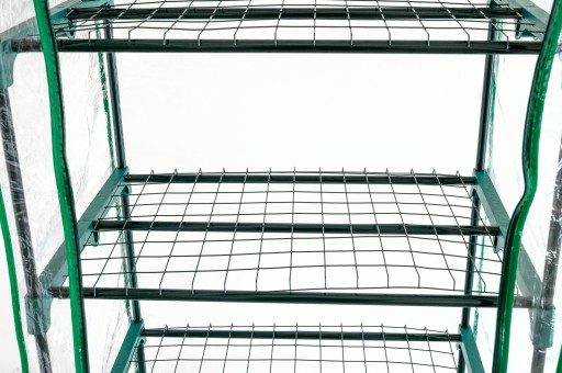 Pokrycie szklarni wykonane jest z przezroczystego PVC o grubości 0,12 mm z wejściem zamykanym na zamka błyskawiczny.
