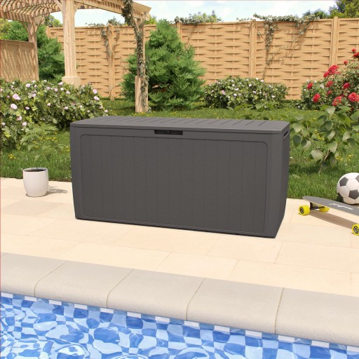 Odporna na warunki atmosferyczne i promieniowanie UV skrzynia na poduszki o pojemności 290 litrów oferuje wystarczającą ilość miejsca do przechowywania.