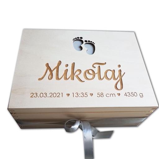 Pudełko ze stópkami, imieniem i metryczką o wymiarach 22x16x8 cm.