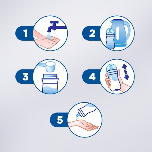 - Używając wyłącznie załączonej, umytej i wysuszonej miarki, odmierz dokładną liczbę płaskich, nieubitych porcji proszku i dodaj je do przygotowanej butelki. Przestrzegaj wartości podanych w tabeli żywienia.