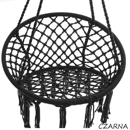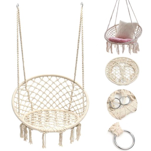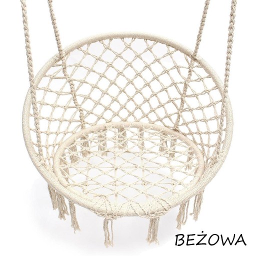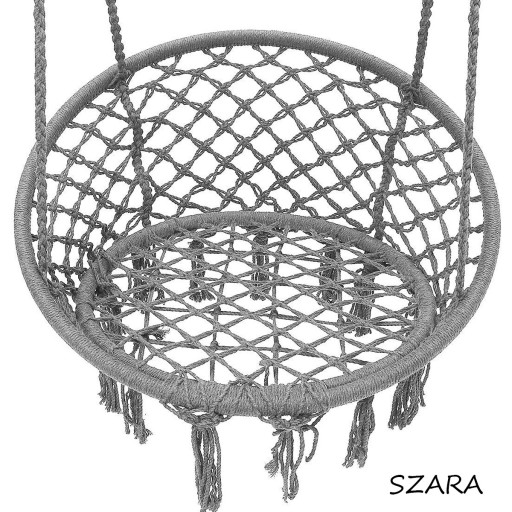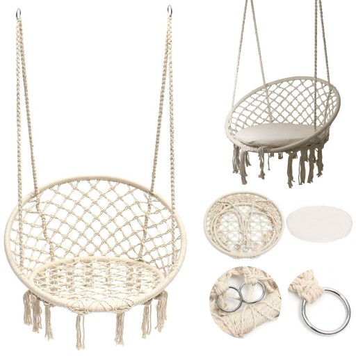 Huśtawka została wykonana z bawełnianego sznurka, który dzięki swoim pięknym splotom wykonanym na wzór makramy idealnie sprawdzi się we wnętrzach boho, w rustykalnych ogrodach, a także jako dodatek do ślubnych sesji zdjęciowych.