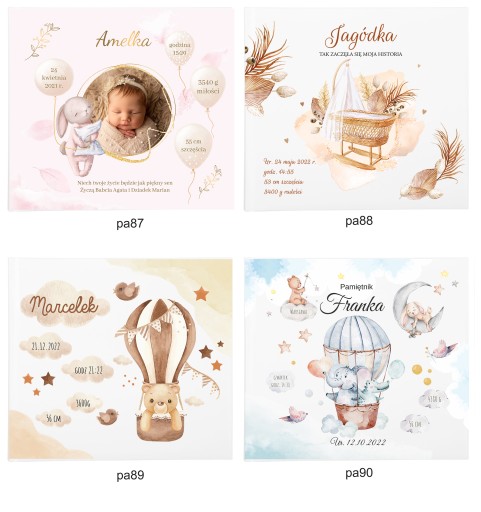 W oczekiwaniu na Ciebie / Twoja rodzina / W dniu Twoich narodzin / Witaj na świecie / W dniu Twoich urodzin (co się działo na świecie) / To Twój dom / Twój pierwszy tydzień / Pierwszy raz.../ Tak mijał pierwszy rok (1,2,3,4,6,8,12 miesiąc) / Odcisk rączki i pierwsze włoski / Twoje ulubione smakołyki / Twoje pierwsze słowa / Pierwsze urodziny / Czas na samodzielność / Pierwsze wakacje / Pierwsze święta Bożego Narodzenia / Twoje ulubione zabawki / Twoi przyjaciele / Pierwszy dzień w przedszkolu / Wyjątkowe momenty / Nasze spostrzeżenia / Twoje pierwsze rysunki / Zabawne sytuacje / Bajeczki i wierszyki napisane specjalnie dla Ciebie.
