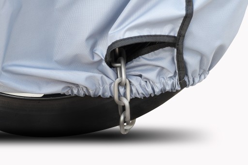 - W przedniej części pokrowca (przy kole) wykonane dwa otwory, które umożliwiają przełożenie linki lub łańcucha antykradzieżowego