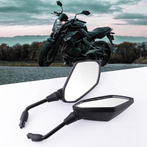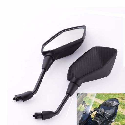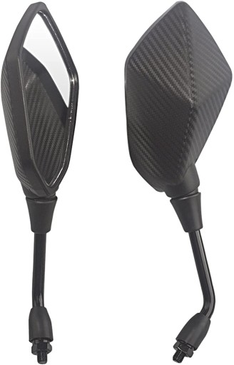 Czarne matowe+CARBON uniwersalne lusterka o oryginalnym kształcie. Mocowane są na metalowym uchwycie o średnicy gwintu 10mm. Posiadają również estetyczną gumową osłonę na mocowanie. Wyposażone są w otwory umożliwiające odprowadzanie wody