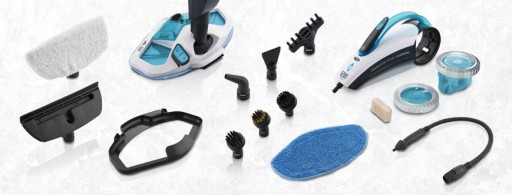 - Akcesoria: elastyczny wąż przedłużający, dysza stożkowa, płaska mini myjka, zakrzywiona dysza pary, szczoteczka do fug, szczotka nylonowa, szczotka mosiężna,duża, okrągła szczotka, szeroka myjka do okien i luster, dysza z mopem, ze zintegrowanym zbiornikiem i szczotką, nakładka z mikrofibry, nasadka do czyszczenia dywanów