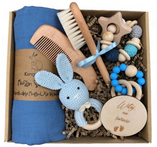 Gotowa kompozycja zawiera aż 7 różnych, niezbędnych przy opiece nad maleństwem eleganckich akcesoriów. Wszystko zachowane w pięknej kolorystyce i zapakowane w eleganckim pudełku z okienkiem. Całość przewiązana niebieską tasiemką.