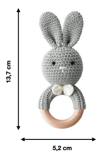 - szary króliczek handmade z wbudowaną cichą grzechotką, wykonany z organicznej bawełny i drewna bukowego,