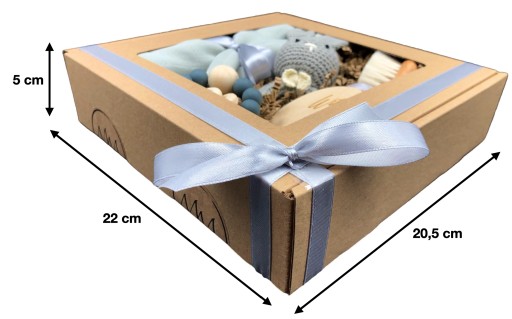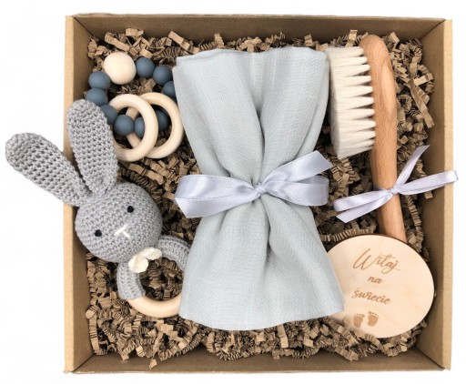 Gotowa kompozycja zawiera aż 5 różnych, niezbędnych przy opiece nad maleństwem eleganckich akcesoriów. Wszystko zachowane w pięknej kolorystyce i zapakowane w eleganckim pudełku z okienkiem. Całość przewiązana szarą tasiemką.