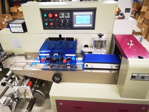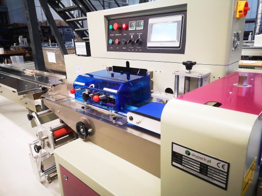 - panel PLC (zmiana długości opakowania, zmiana szybkości pakowania, regulacja położenia produktu względem noży itp),