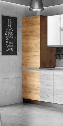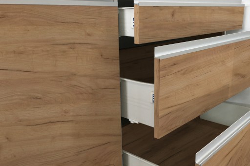 -szafki górne - płyta MDF ,kolor: biały połysk HG gr. 18 mm, szafki dolne- płyta laminowana, kolor: dąb craft gr.18 mm