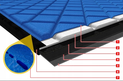 - Pianka poliuretanowa (10mm) o zwiększonej elastyczności, zapobiega ubytkom sztywności podczas użytkowania oraz zapewnia przepuszczalność powietrza dzięki otwarto-porowatej strukturze komórkowej.