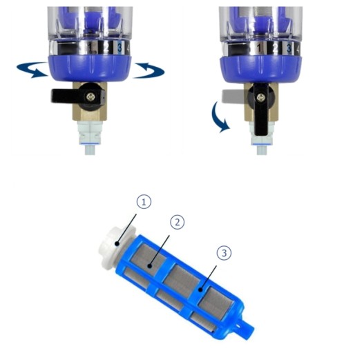 Regularna obsługa polega na kontroli stopnia zanieczyszczenia wkładu (obudowa jest przejrzysta) i jeżeli widoczne są zanieczyszczenia na odkręceniu zaworu spustowego filtra. Czynność tą wykonuje się bez wyłączania zasilania wody, kilka razy należy pokręcić w prawo i lewo pokrętłem skrobaka, który oczyszcza mechanicznie powierzchnie siatki.