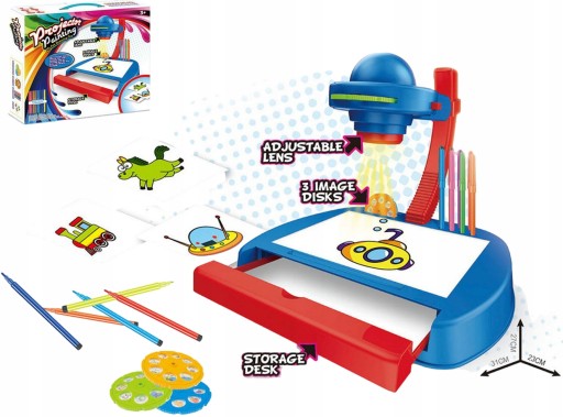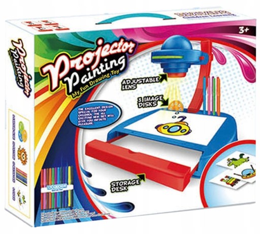 Projektor to bardzo ciekawa propozycja dla malucha lubiącego malować oraz rysować. Tablica z rzutnikiem razem z 24 wzorami do wyświetlania, zainteresuje każdego małego artystę. Zabawy i nauki nigdy nie będzie końca ! Rozwijaj wyobraźnię, zdolności manualne i artystyczne Twojego dziecka od najmłodszych lat .Projektor posiada regulację ostrości , wysokość i wysuwaną szufladkę na pracę.