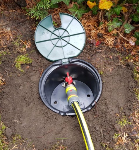 Studzienka poboru wody z zaworem 3/4” występuje w konfiguracji z zieloną pokrywą (wersja łatwo ukryć – HIDE) oraz z pokrywą pomarańczową (wersja łatwo znaleźć – FIND).