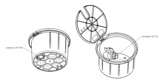 Studzienka poboru wody jest to pojemnik z tworzywa sztucznego z pokrywą zamontowaną na zawias. Wewnątrz studzienki został umieszczony metalowy zawór kulowy. Zawór posiada przyłącza gwintowane 3/4 cala na wlocie jak i wylocie. Studzienkę należy zamontować na równi z gruntem, tak aby było możliwe otwarcie pokrywy. Zalecamy podłączenie studzienki w wodę, wykonać przy pomocy kolana PE GZ 3/4 cala.