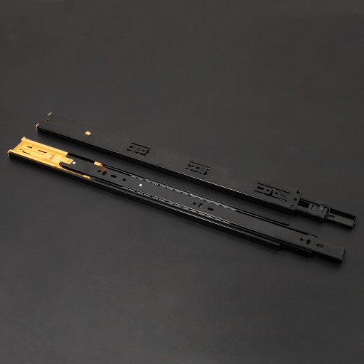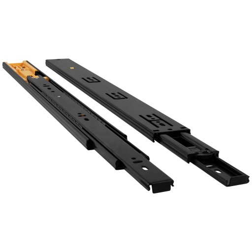 - Cechy produktu: Pełny wysuw, Cichy domyk, Możliwość demontażu części prowadnika, Teleskopowa budowa prowadnicy, Elegancki czarny kolor