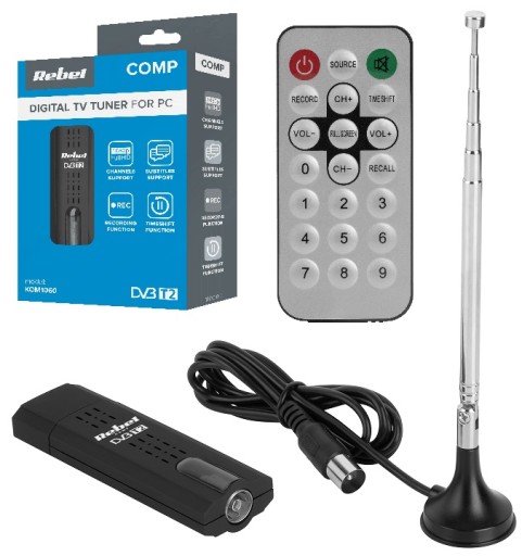 Tuner DVB-T2 do laptopa Rebel charakteryzujące się dużą czułością na sygnał oraz umożliwia dostosowanie jasności, kontrastu, nasycenia obrazu. Urządzenie posiada także wiele rozbudowanych funkcji m.in. obsługę napisów, teletekstu, zatrzymanie kanału transmitowanego na żywo (Time Shift), obsługę nagrywania i przechwytywanie wideo w czasie rzeczywistym. Dodatkowo tuner odtwarza dźwięk stereo oraz umożliwia słuchanie radia w standardzie FM, DAB, VHF i UHF.