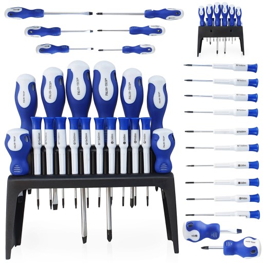 Zestaw śrubokrętów sprawdzi się w każdym garażu czy warsztacie.Dołączony w zestawie stojak ułatwia przechowywanie śrubokrętów. Z tyłu stojaka znajdują się 2 otwory montażowe umożliwiające powieszenie całego zestawu na ścianie.