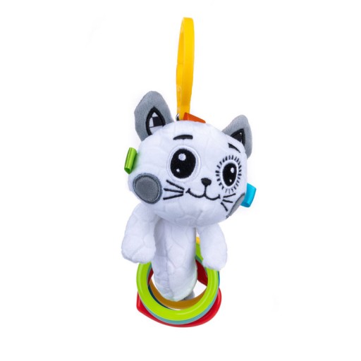Zabawny, kontrastowy kotek skradnie serce Twojego Maluszka! Jego główkę zdobią metki o zróżnicowanej fakturze, a brzuszek – kolorowe kółeczka, które wesoło grzechoczą przy potrząsaniu. Praktyczna klamra pozwoli przymocować zabawkę w dowolnym miejscu.