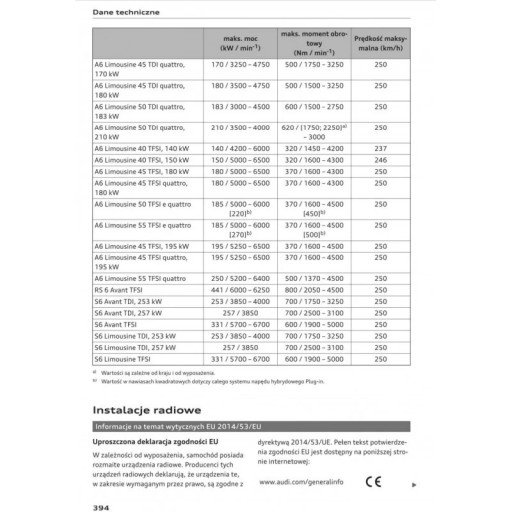 Instrukcja obsługi Audi zawiera wszystkie wersje wyposażenia oraz przydatne informacje jak sprawnie i bezpiecznie użytkować pojazd np.-wskaźniki, lampki kontrolne, otwieranie i zamykanie-oświetlenie i widoczność, fotele, schowki, ogrzewanie, wentylacja, klimatyzacja-jazda, wskazówki eksploatacyjne, konserwacja pojazdu-poziomy płynów, sprawdzanie i uzupełnianie, czynności awaryjne, wymiana kół, bezpieczniki, wymiana żarówek-dane techniczne... oraz wiele wiele innych rzeczy, które dają poczucie bezpieczeństwa oraz komfortu podróżującym .Polskie prawo nakłada na sprzedawcę obowiązek dołączania instrukcji obsługi auta w języku polskim do . Instrukcja obsługi auta jest nowa i w języku polskim.