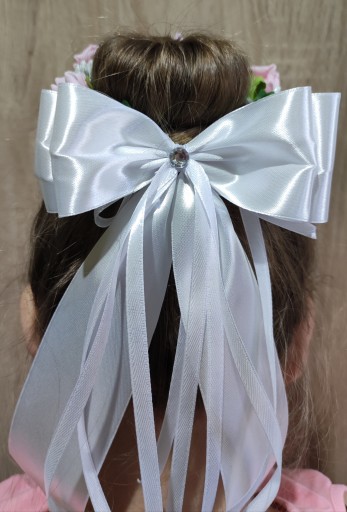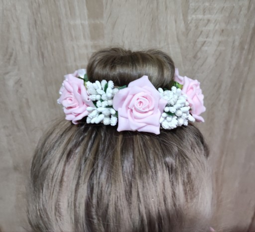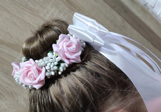 Wianek wykonany jest z różyczek piankowych i dodatków florystycznych. Kwiaty wyglądają bardzo realistycznie sprawiając, że dziewczynka będzie wyglądała delikatnie i elegancko w dniu Komunii Świętej.